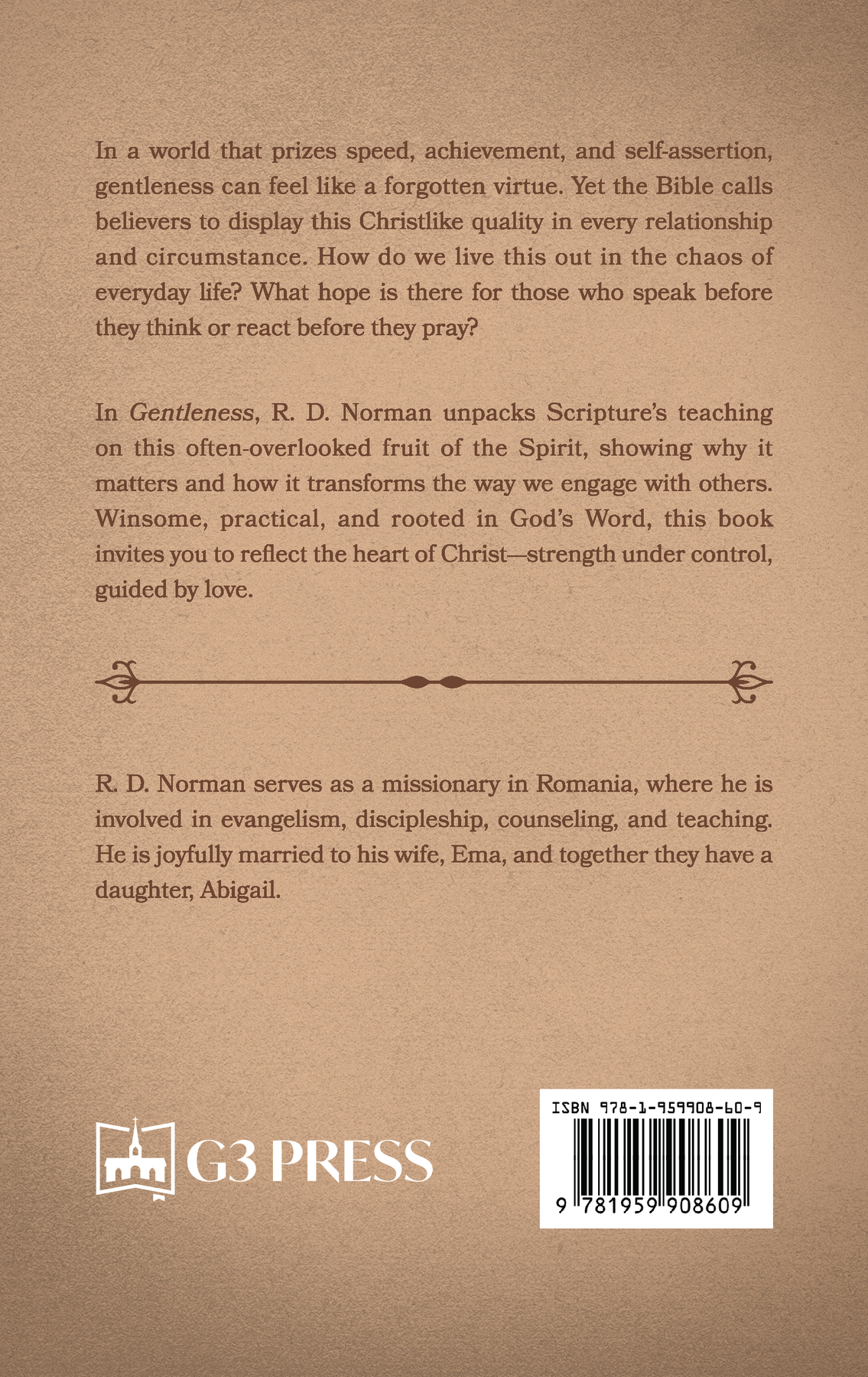 In Gentleness, R. D. Norman unpacks Scripture’s teaching on this often-overlooked fruit of the Spirit, showing why it matters and how it transforms the way we engage with others. Winsome, practical, and rooted in God’s Word, this book invites you to reflect the heart of Christ—strength under control, guided by love.